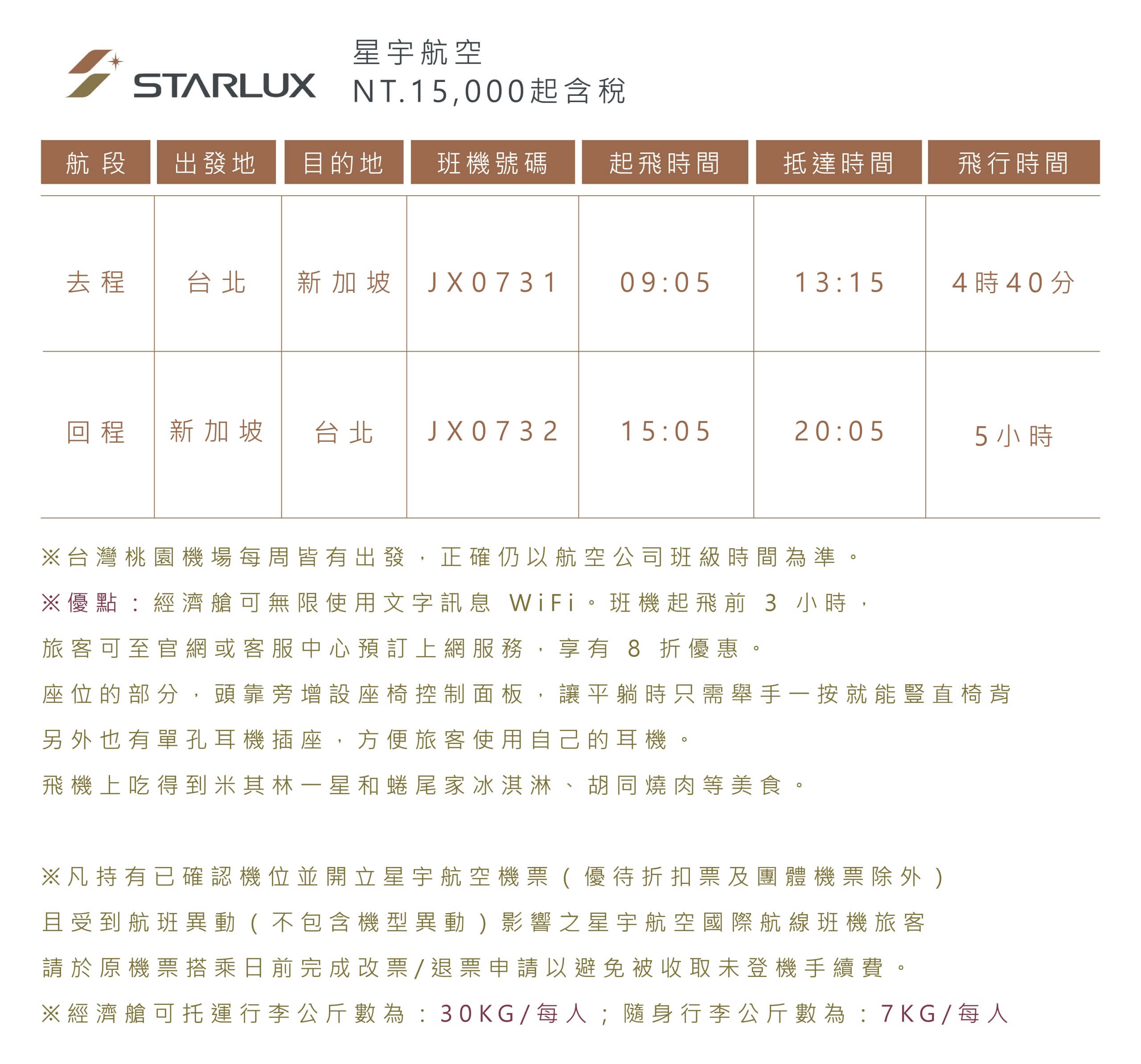 - 台灣飛新加坡可選擇航空公司:星宇、長榮、華航、酷航、新加坡航空。