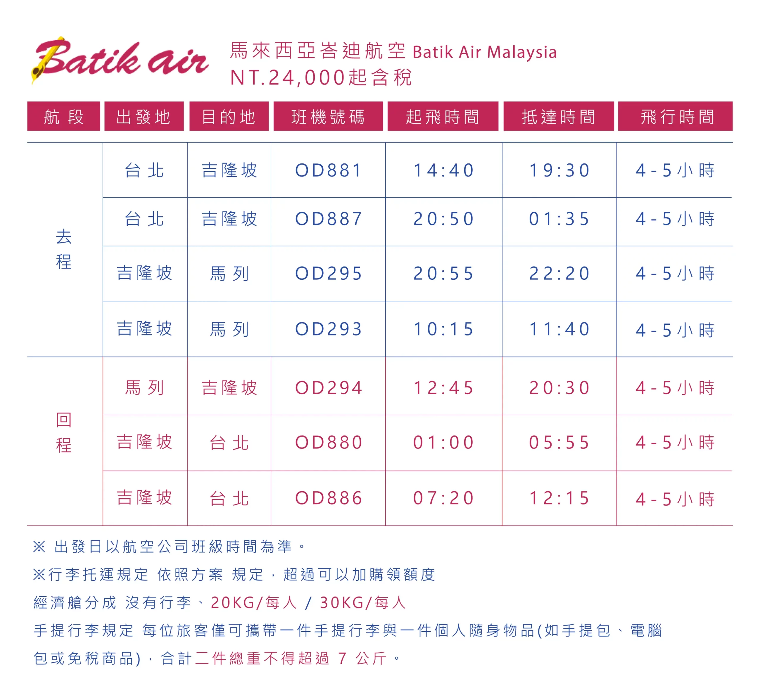 ▲需預訂機位,請提供護照上正確中/英文名字及預計台灣出發+馬列回程日期,以利預訂機位,如有疑問請洽克拉拉顧問。