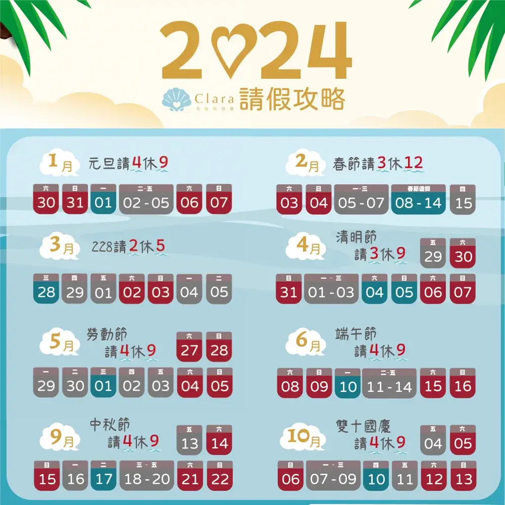 Array ( [0] => https://clara72.gooelg1.com/wp-content/uploads/2022/05/2024休假請假攻略.jpg [1] => 1080 [2] => 720 [3] => ) 2024連假怎樣休!請假攻略休起來,開心放10天、16天!!! 2024年(民國113年),依照行政院人事行政總處公布連續假期與補班日,應該都是大家最期待跟最想知道的資訊,克拉拉旅遊貼心提供2024年連休的假期與該怎樣請假最無縫接軌。也提供那些月份是適合去馬爾地夫旅遊,想出遊這樣排最划算。2024連假國定假日放假日期 上一篇 下一篇