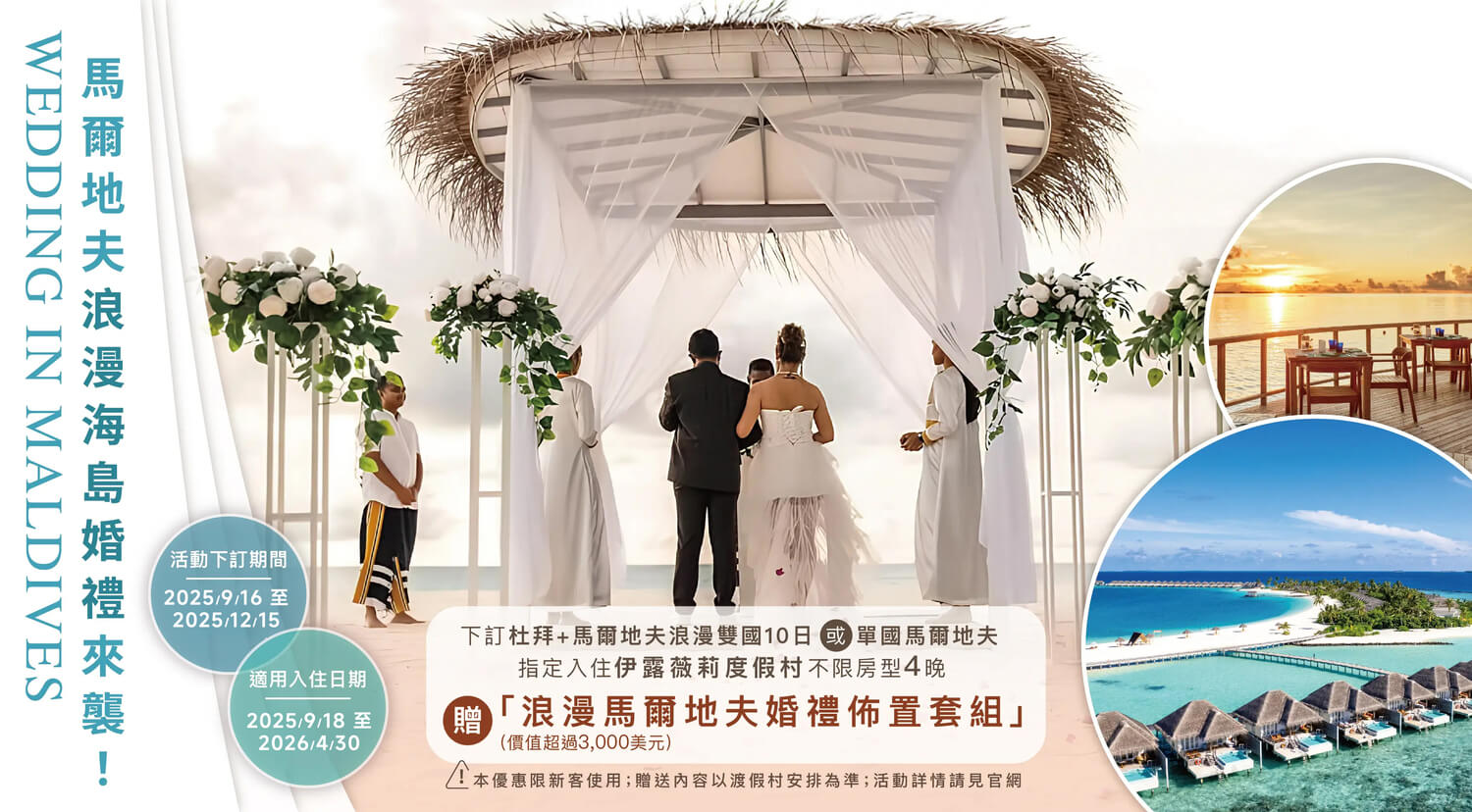 2025/9/16至2025/12/15前,下訂四晚馬爾地夫伊露薇莉度假村(不限房型),不僅能享受無與倫比的度假體驗,還能獲得價值超過三千美元的免費婚禮套裝👰🏻♀️🤵🏻♂️ 如果您正在計畫婚禮,或尚未在臺灣舉辦婚禮,伊露薇莉度假村將是您的完美選擇,讓浪漫與奢華結合,打造您此生最難忘的瞬間❤️