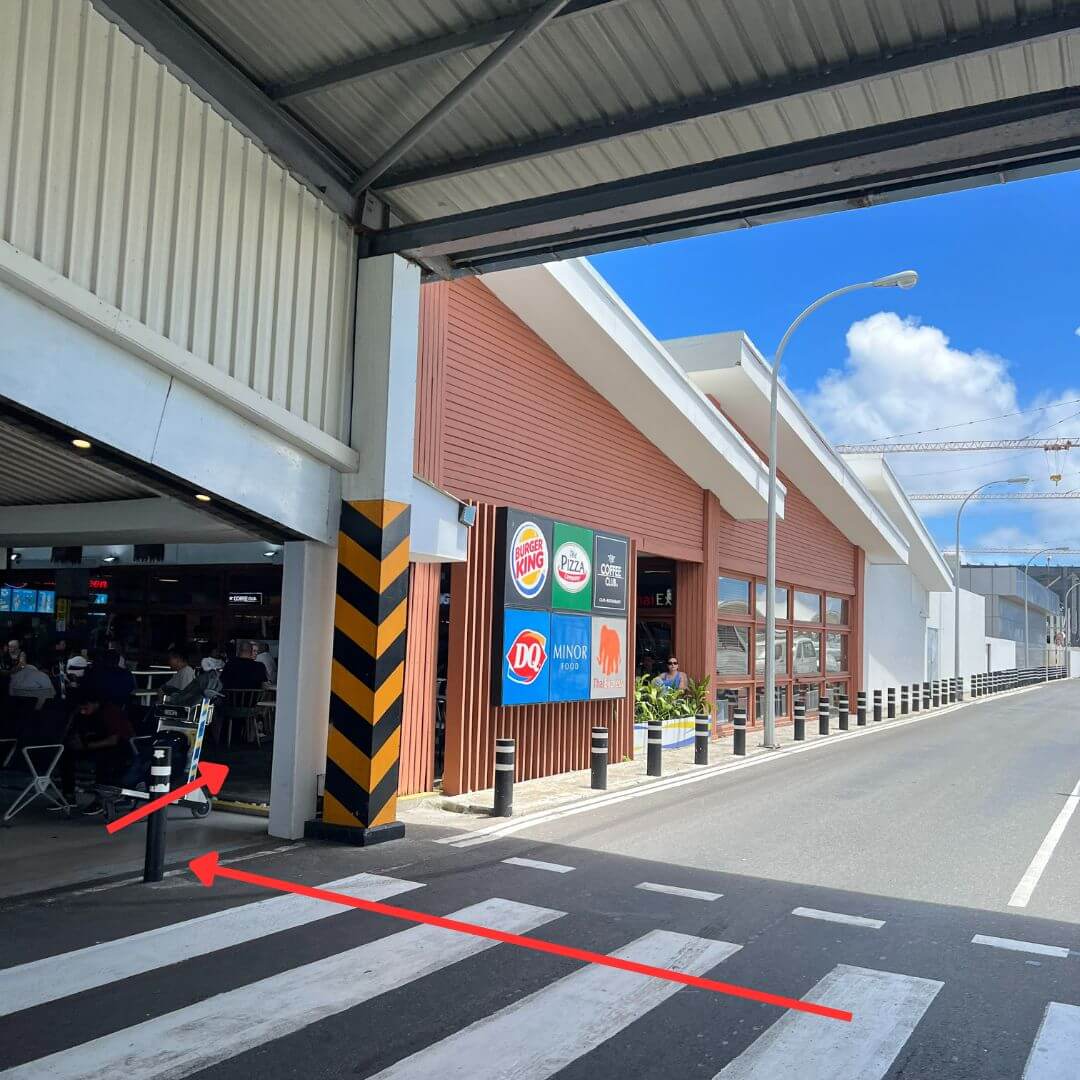 1. 從碼頭上岸後,往前穿越馬路會看到舊航廈 T2 的入口方向。