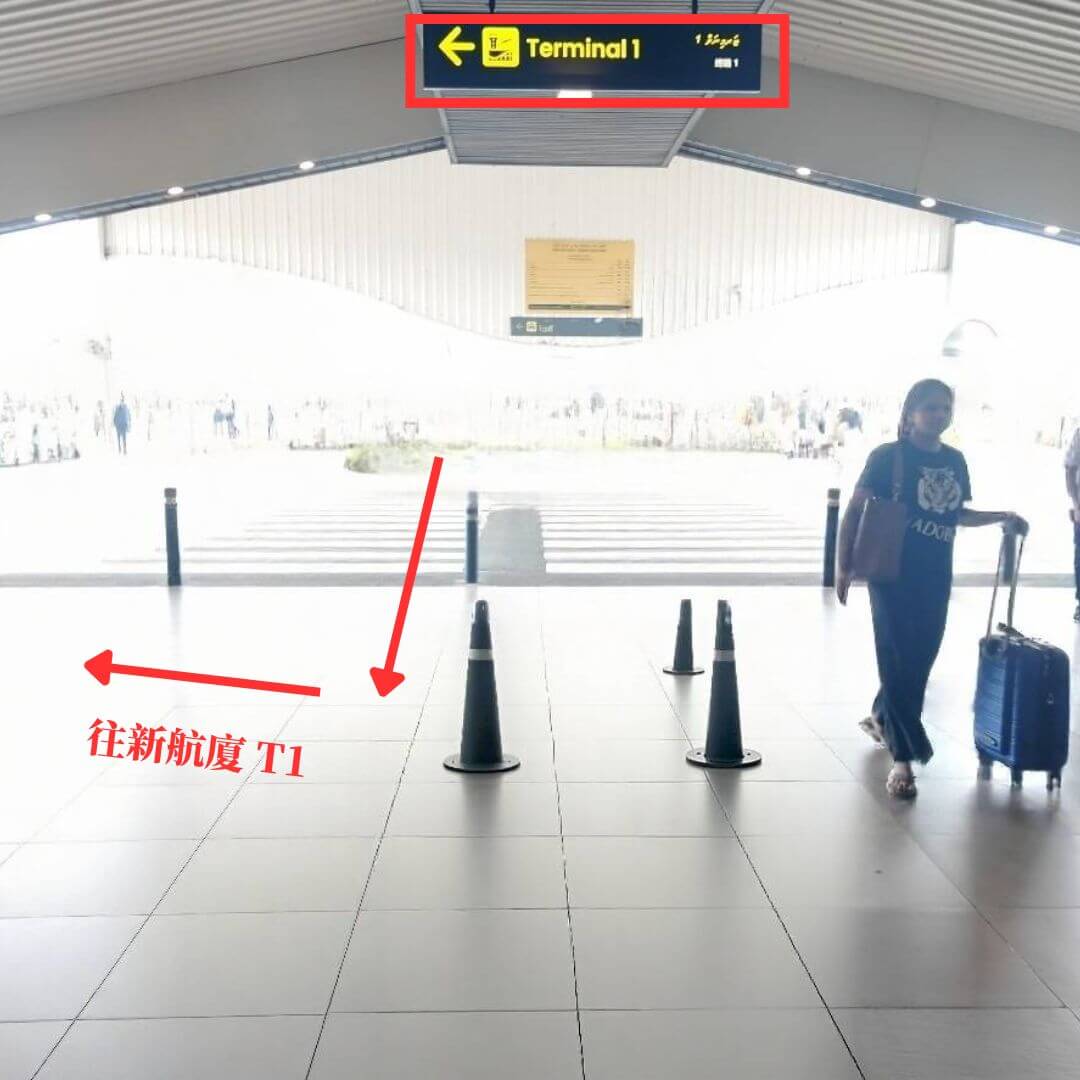2. 來到T2入口的右手邊,可以看到前往新航廈 T1 的指示,前往T1的室內通道沿著指標一路前行,不需要走到戶外,非常好辨識。
