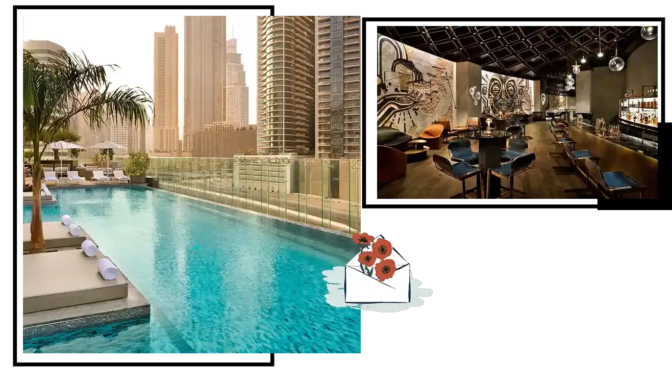 阿聯酋第一家精品酒店英迪格酒店 Hotel Indigo Dubai Downtown 。配有奢華的珍珠母浴室、時髦的 Moroso 設計師椅子和景觀。入住時可在在 25 公尺無邊際泳池放鬆。