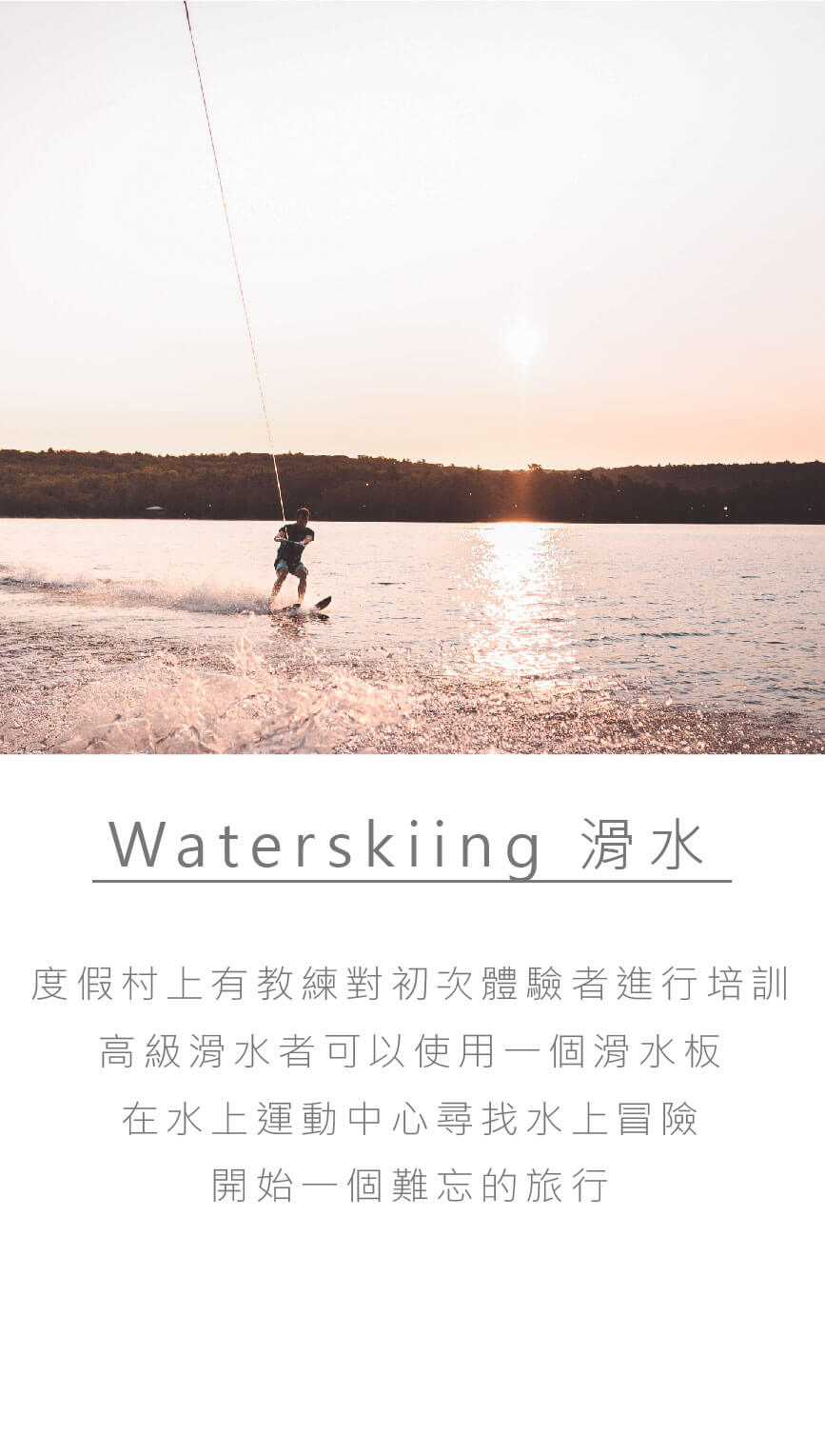 馬爾地夫風平浪靜的瀉湖中最適合的運動就是滑水。度假村上有教練對初次體驗者進行培訓。高級滑水者可以使用一個滑水板,但是對於初學者來說,為了可以安定身體,最好是使用兩個滑水板。首先抓住固定在船上的扶手,進行水上站立的練習。然後抓住連接繩索的扶手滑行,方法非常的簡單。在水上運動中心尋找水上冒險,開始一個難忘的旅行