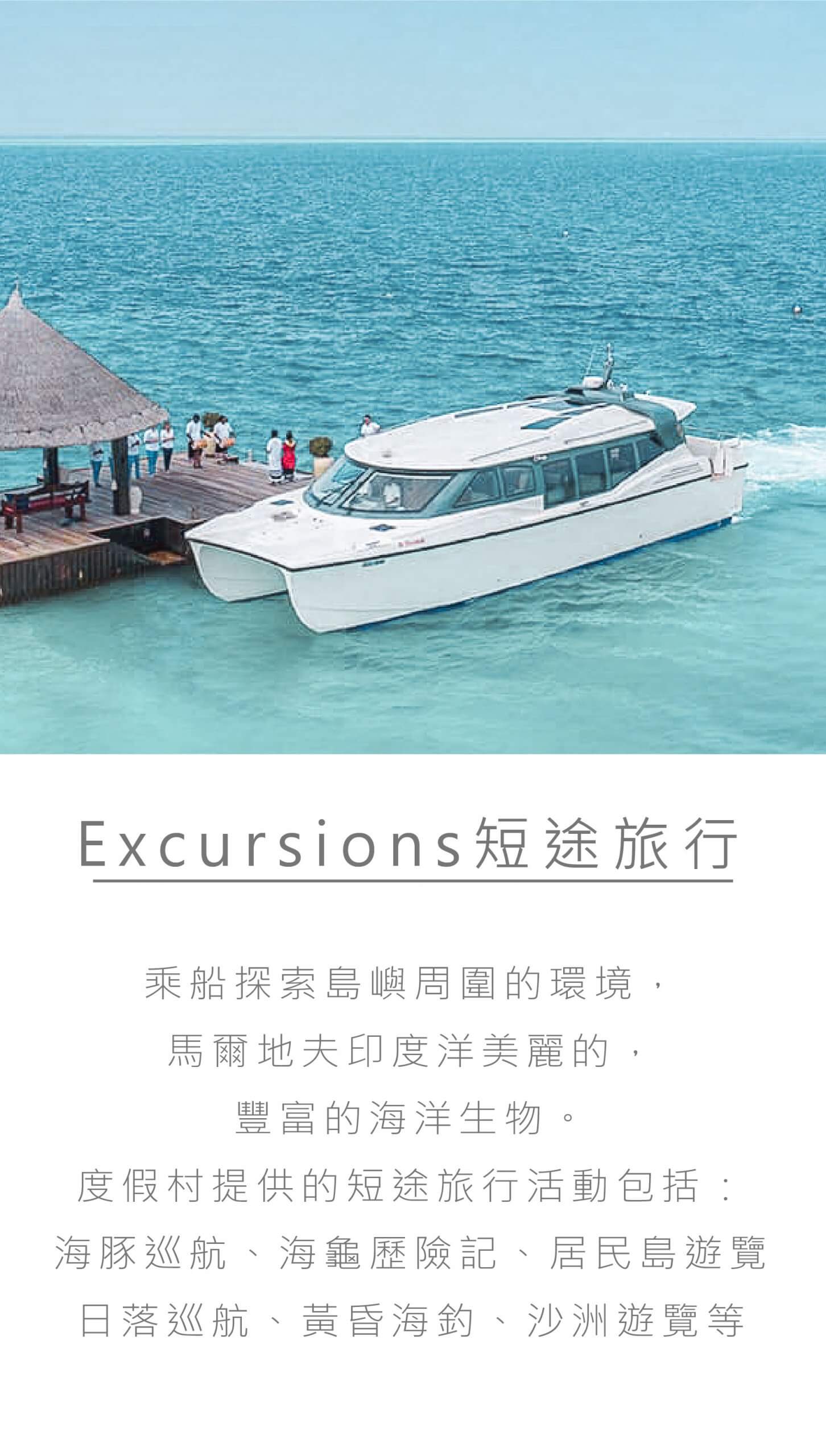 在馬爾地夫旅遊渡假,除了可以悠閒地在渡假村內舒適享受各種服務外渡假村也有提供許多出海活動像是潛水、沖浪、落日垂釣、動力浪板、浮潛、濁木舟、風帆與休閒行程給客人!