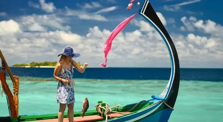 從馬列機場搭乘快艇上島,欣賞海岸美景與島嶼,感受環礁、珊瑚礁島的生態之美。