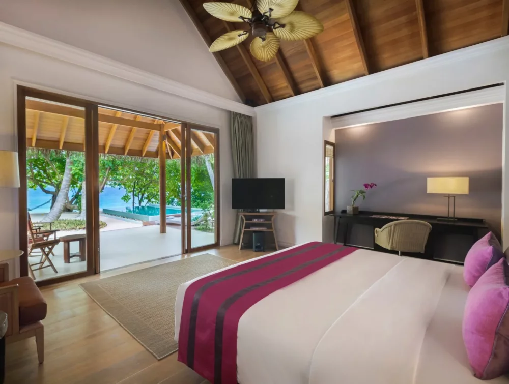 度假村以泰式風情為主題,結合馬爾地夫的熱帶景致,100間獨立別墅及典雅套房,房型設計講究私密性與奢華感,泰式建築元素結合現代設計,營造出寧靜舒適的寬敞居住空間。