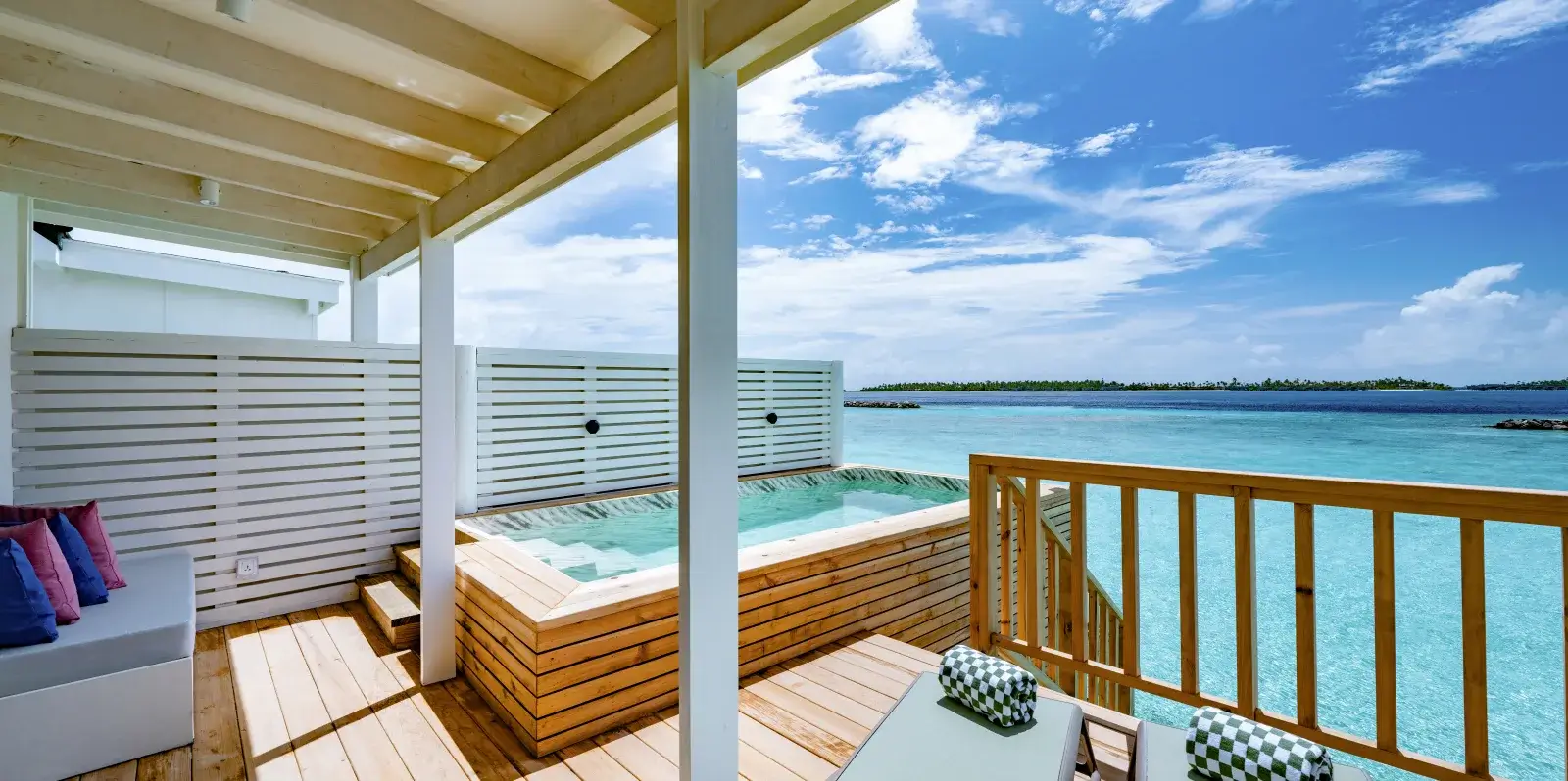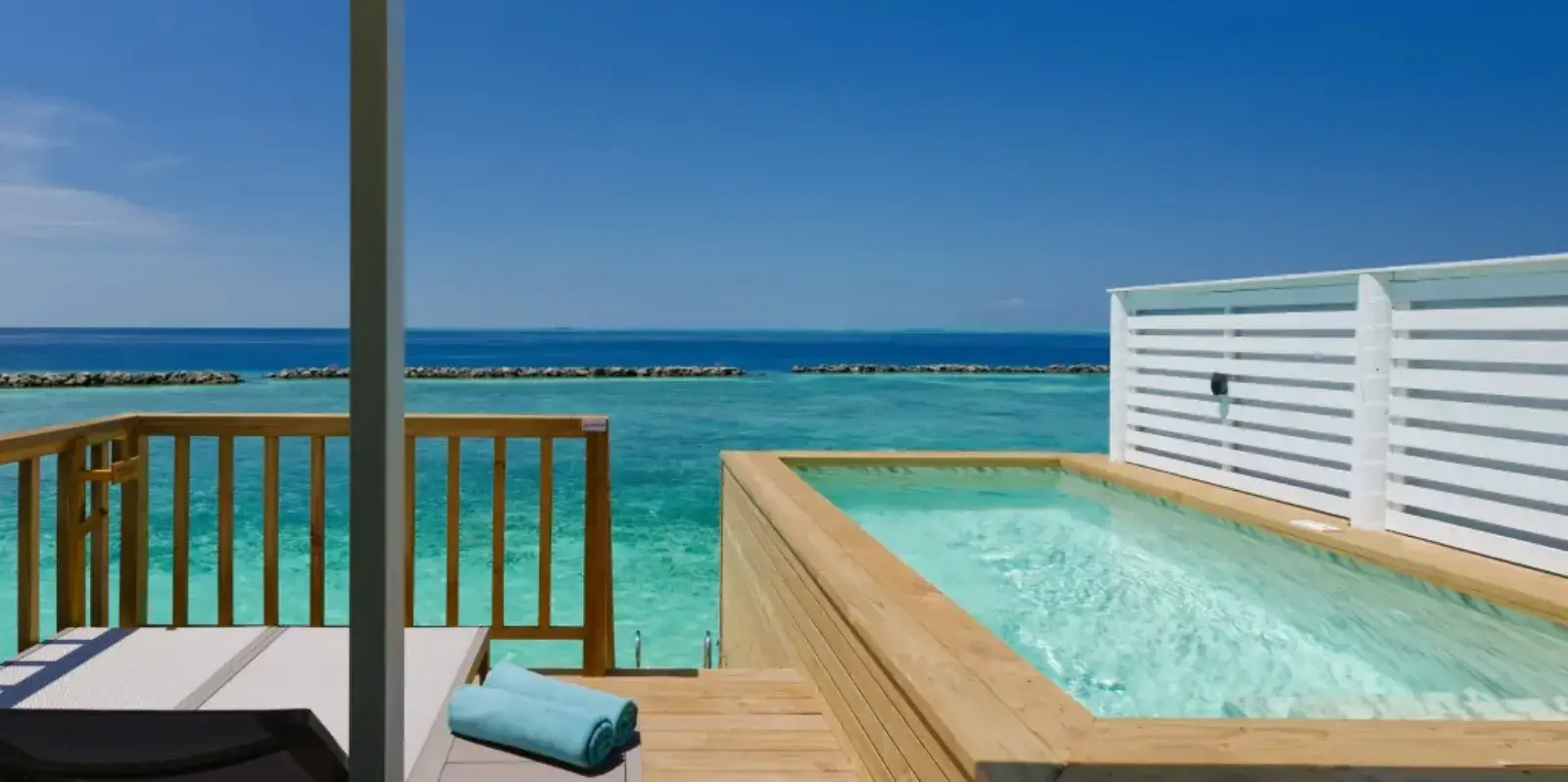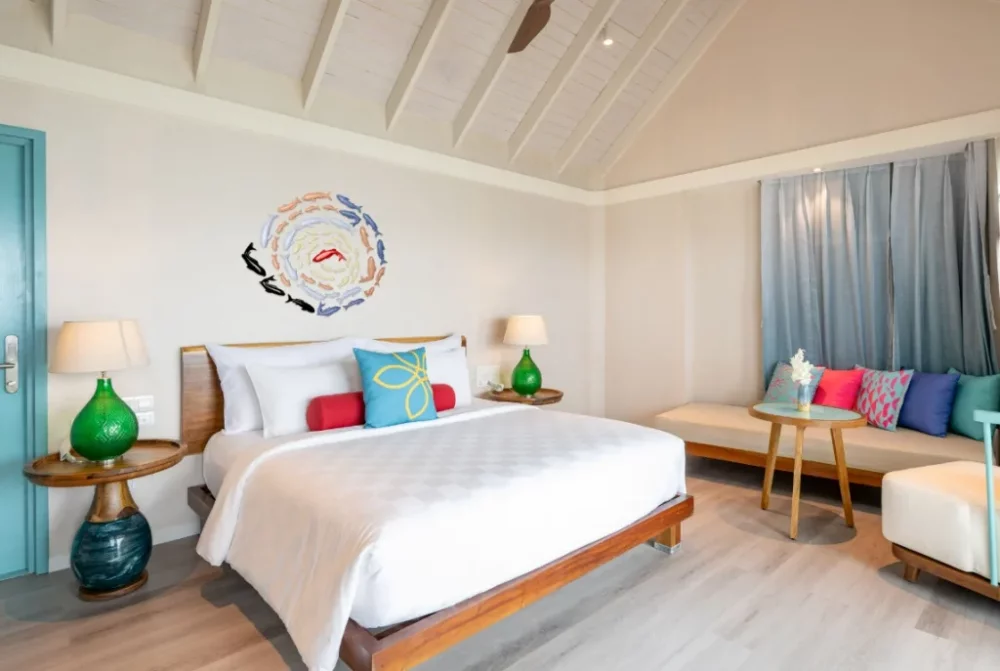 水上別墅坐落於美麗的藍色海域之上,擁有採光充足的室內空間和炫彩斑斕的熱帶色彩室外區。別墅內設有豪華大床、海景浴室、10平方米的游泳池和日光躺椅,別忘了欣賞水下豐富珊瑚生態。