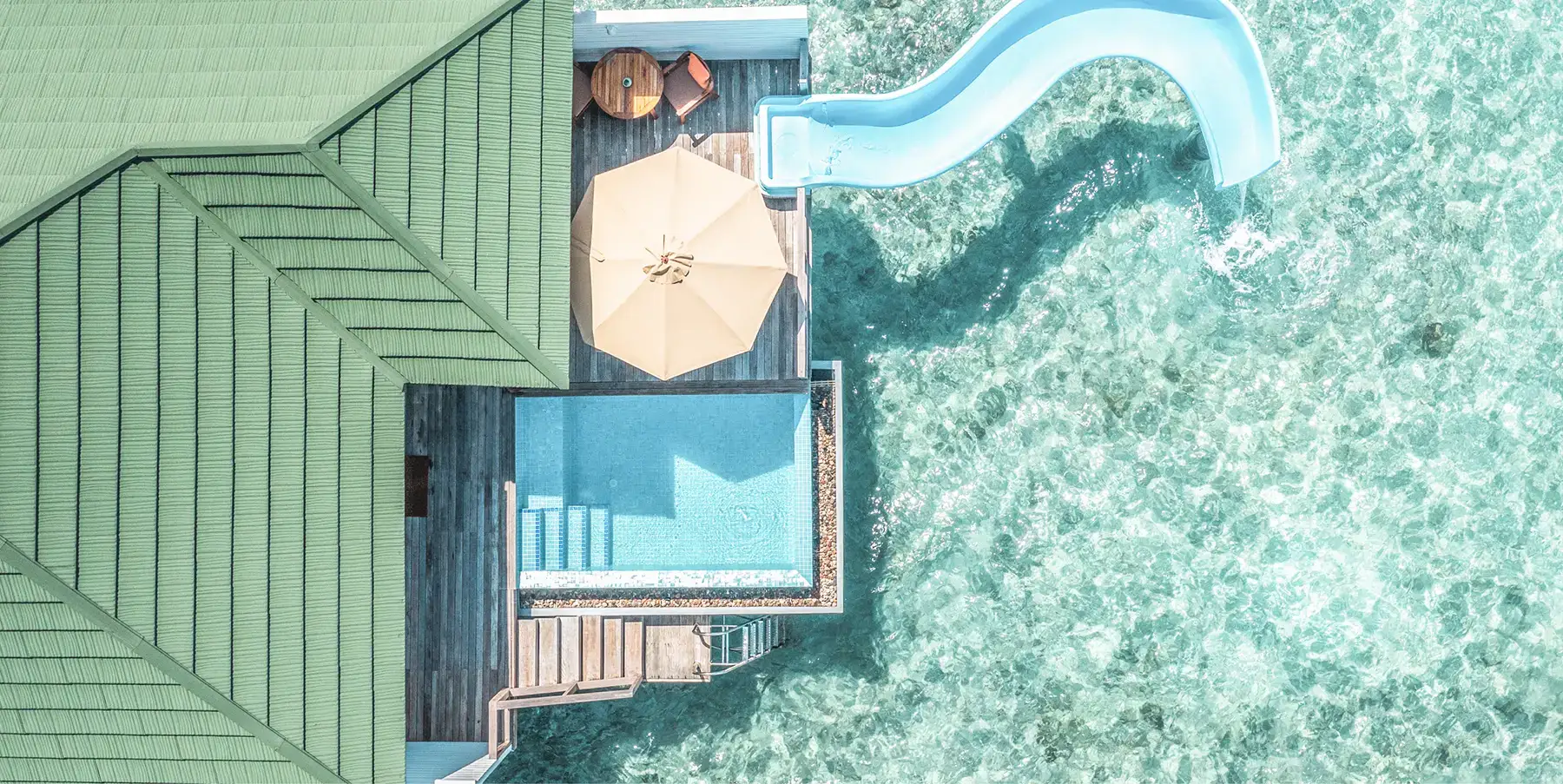 潟湖泳池滑梯套房,告別傳統的水上別墅,設計注重隱私又不缺時尚造型感,讓你的度假充滿趣味。