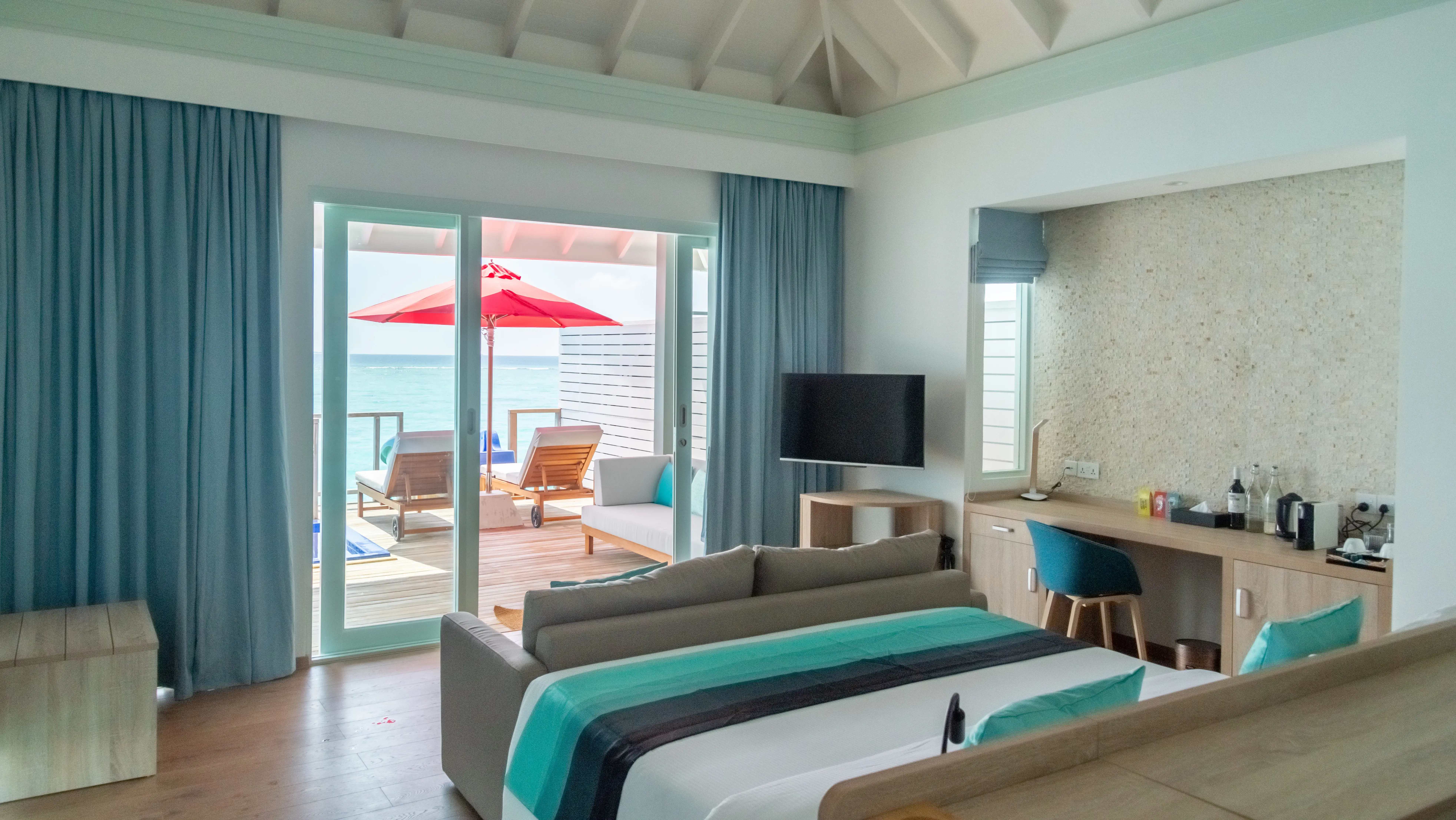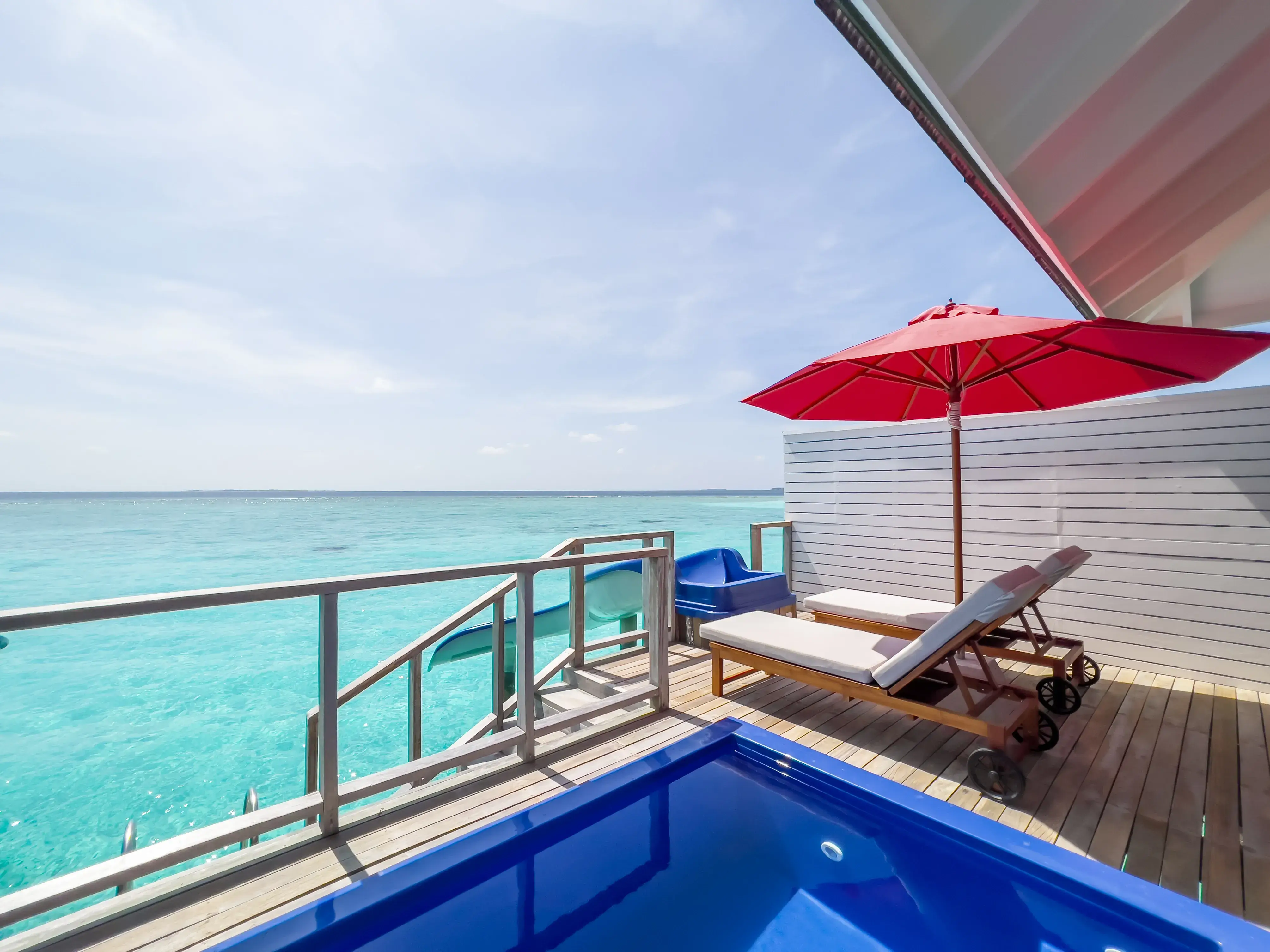 海洋泳池滑梯套房,享受帶日光浴躺椅的私人日光浴平台、迷你吧、無線網絡和印度洋的美景。