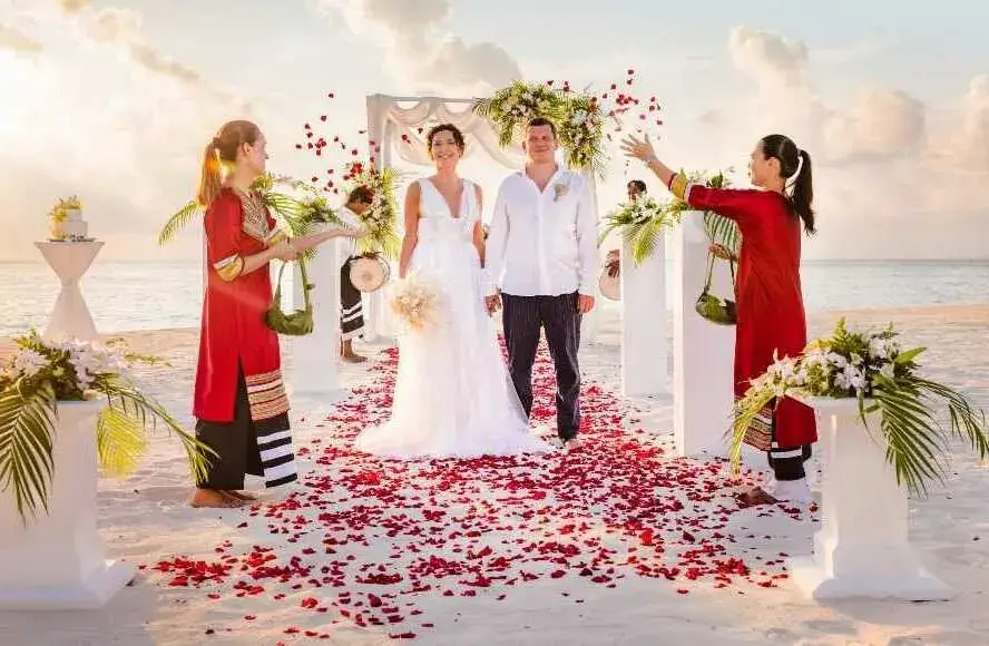 而在一些五星級奢華島嶼的婚禮更為複雜,會有一些婚禮的套餐,比如包含有攝影師,全程大量紗廉和鮮花裝飾,豪華蜜月晚餐,雙人SPA等等。還會有一個特別的婚禮場所。但這樣一套的流程需要2000-3000美元不等。浪漫一生從馬爾地夫開始。
